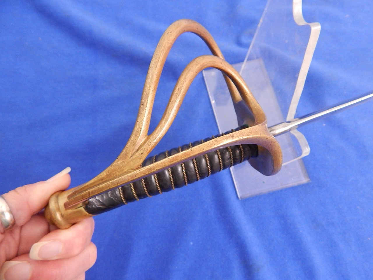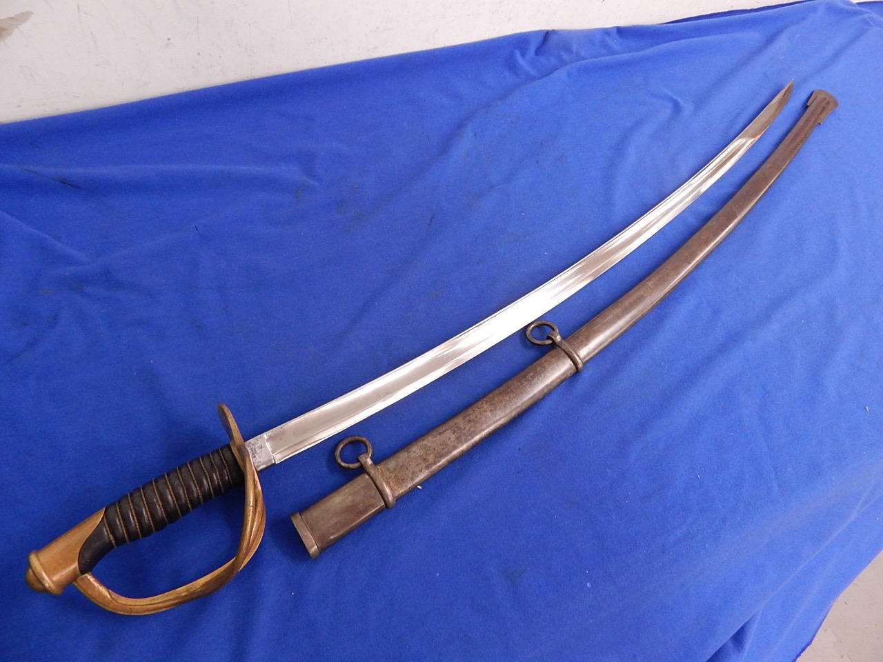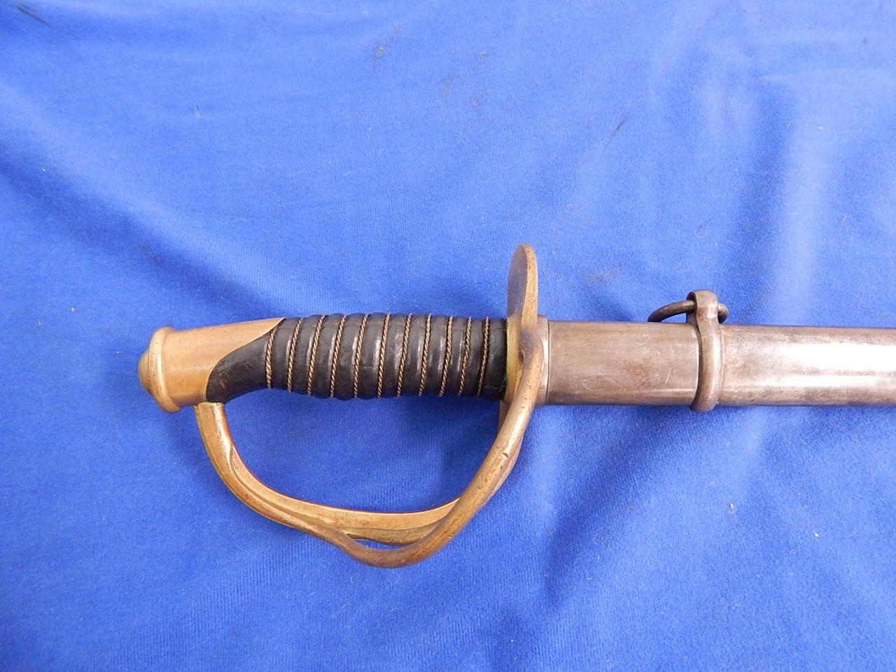 Ames 1862 Dated Cavalry Saber W/S overall 43″ in very fine condition. Blade is very fine with nice markings. Leather grip is very fine. Blade fits scabbard perfect. Overall a very nice example of this scarce 1862 dated saber.