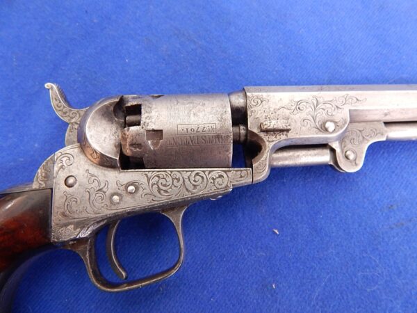 Colt M-1849 Factory Engraved London Revolver, Barrel 5″ sn #77xx, overall 10 1/2″ in fine condition. All markings are present, bore and actions are fine. The high grade burl wood grips are very fine. Backstrap and trigger guard retain most of the original silver. Cylinder retains an excellent scene. Metal is beautifully engraved throughout. Overall a very attractive 1855 manufactured pocket model revolver that is rarely encountered engraved.