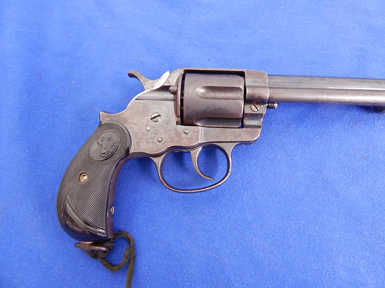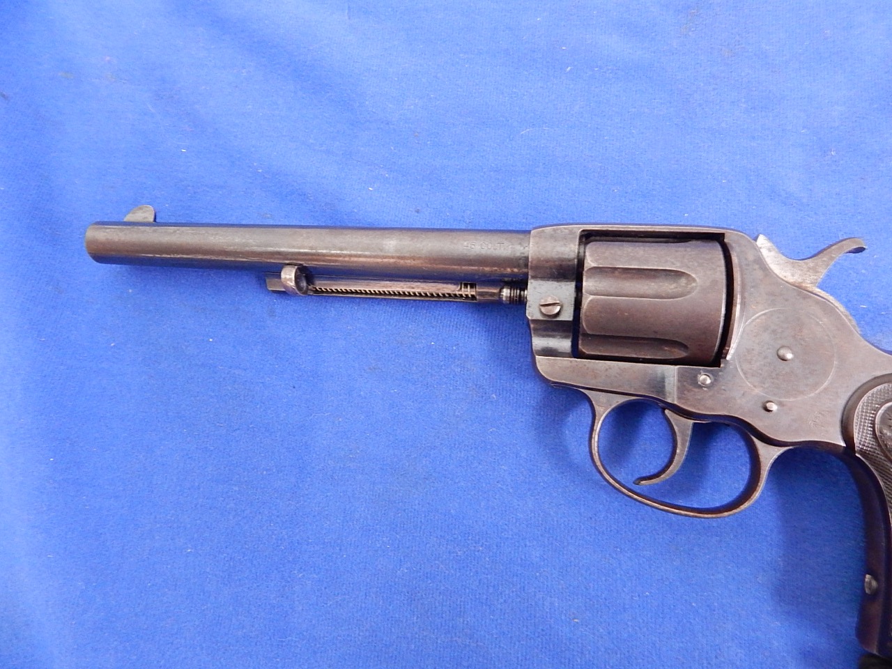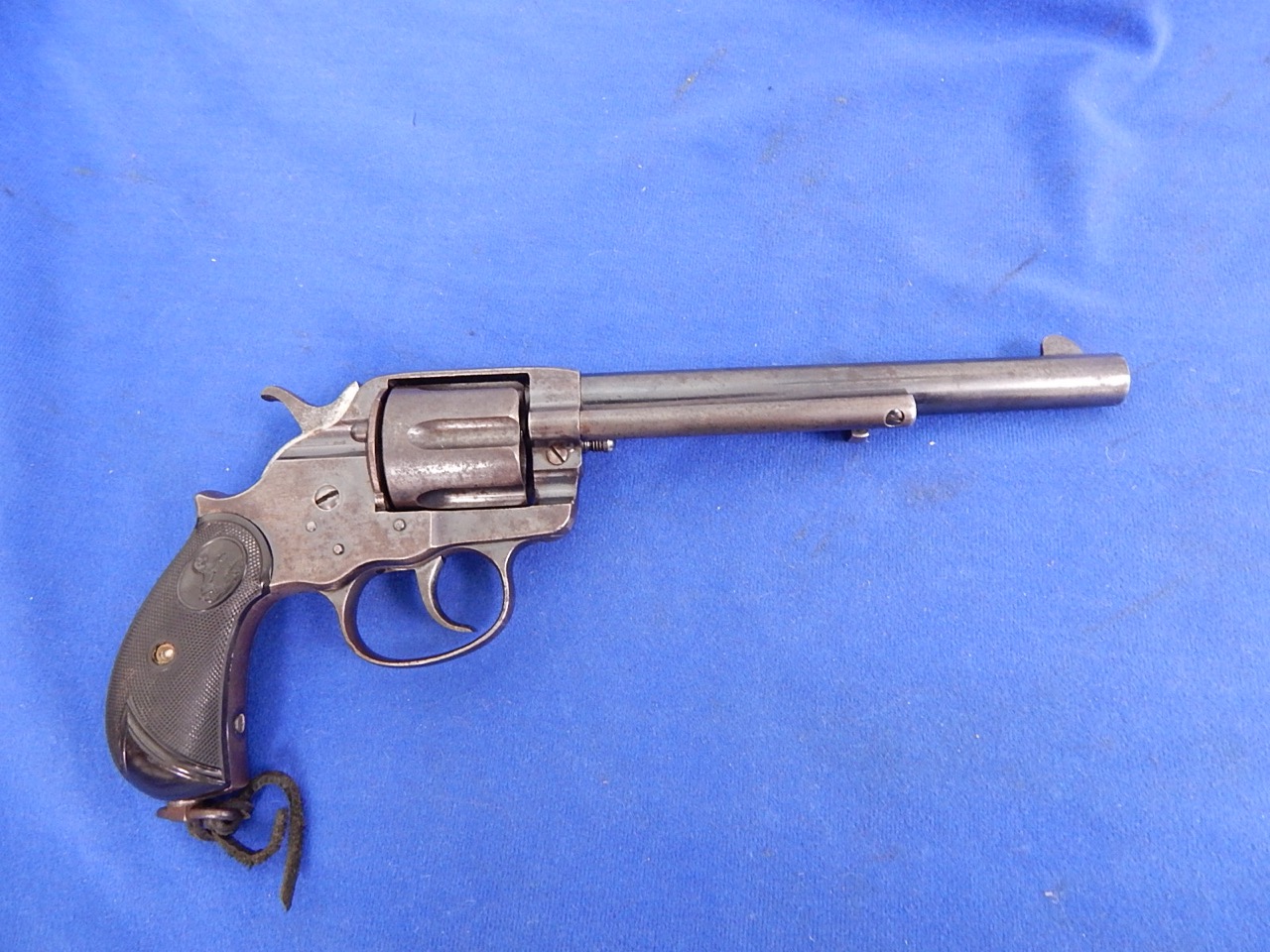 Colt M-1878 Double Action 45 Caliber Manufactured 1895, sn #34xxx, overall 18″ , Barrel 7 1/2″ in fine + condition. All markings are present. Actions are fine. Metal retains an even appearance with around 40-45% blue. The checkered rampant Colt grips are very fine. A very nice looking example of these desireable 7 1/2″ revolver.