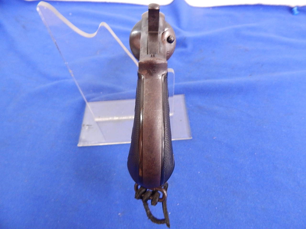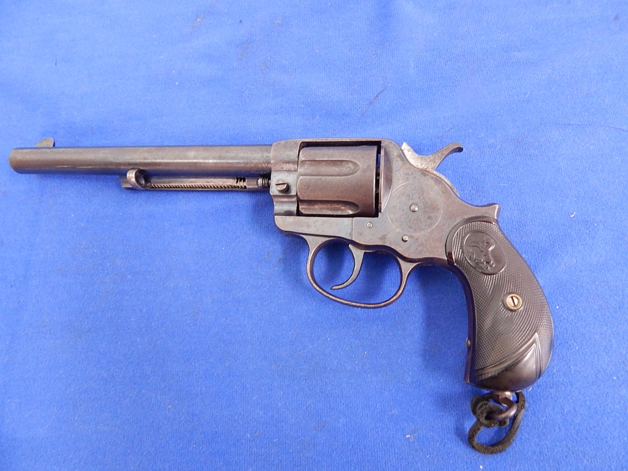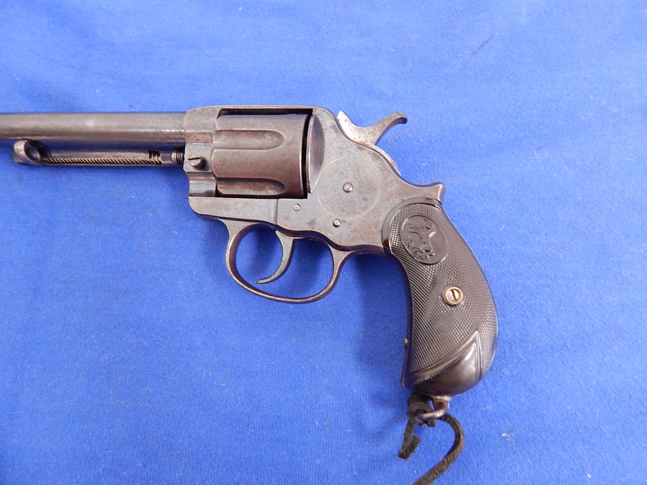 Colt M-1878 Double Action 45 Caliber Manufactured 1895, sn #34xxx, overall 18″ , Barrel 7 1/2″ in fine + condition. All markings are present. Actions are fine. Metal retains an even appearance with around 40-45% blue. The checkered rampant Colt grips are very fine. A very nice looking example of these desireable 7 1/2″ revolver.