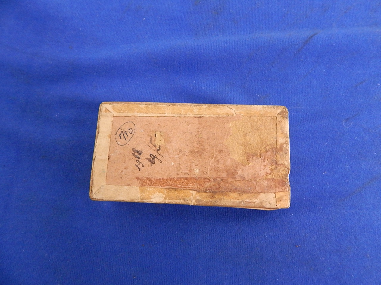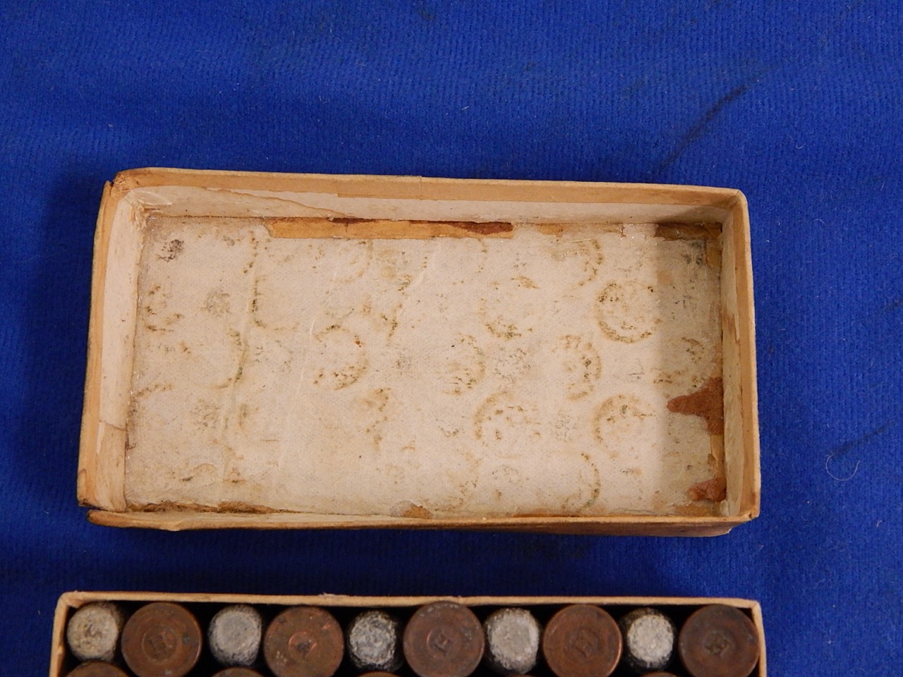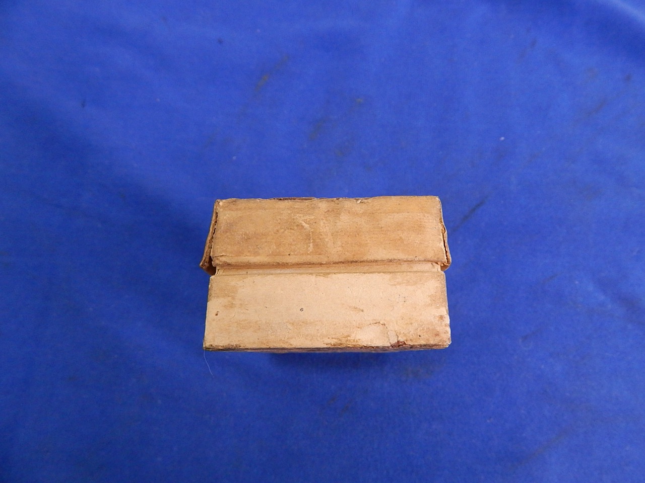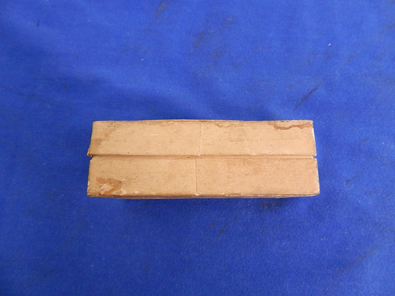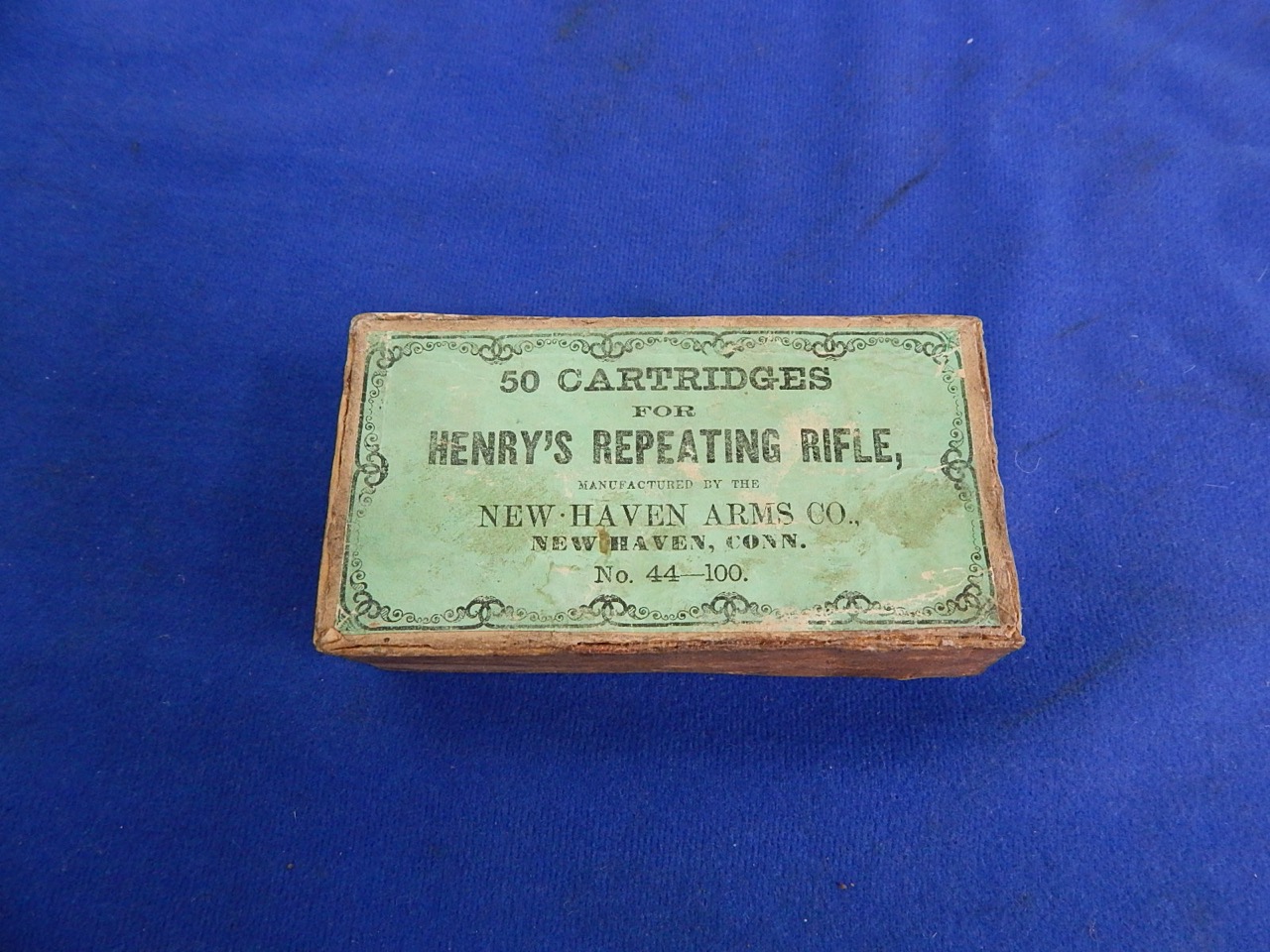 Henry’s Repeating Rifle 50 Cartridge Pack by New Haven Arms, overall 4 1/2″ x 2 3/8″ x 1 1/2″ in fine condition. Cartridges are of post war Flat Nose type. All have H head stamp.