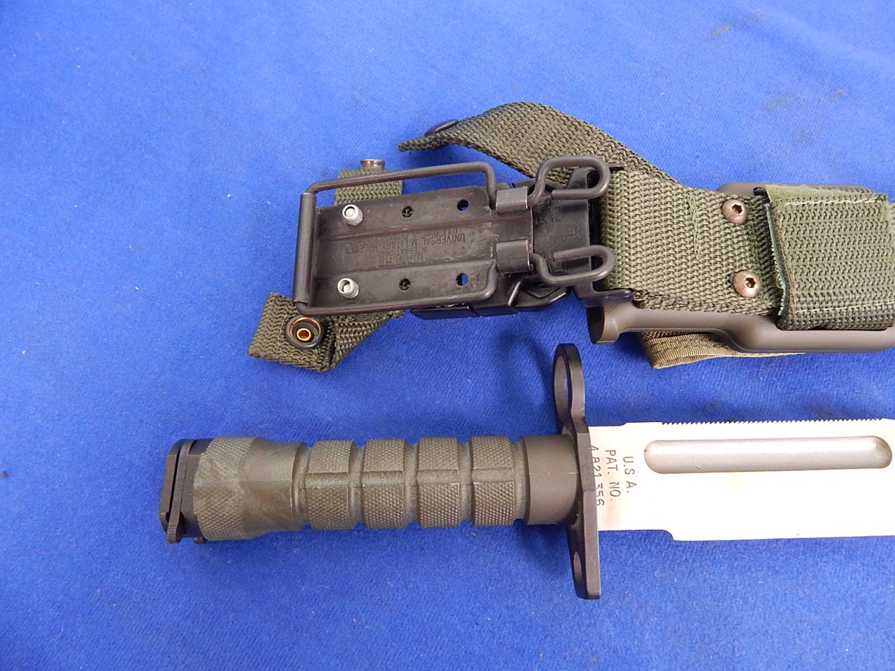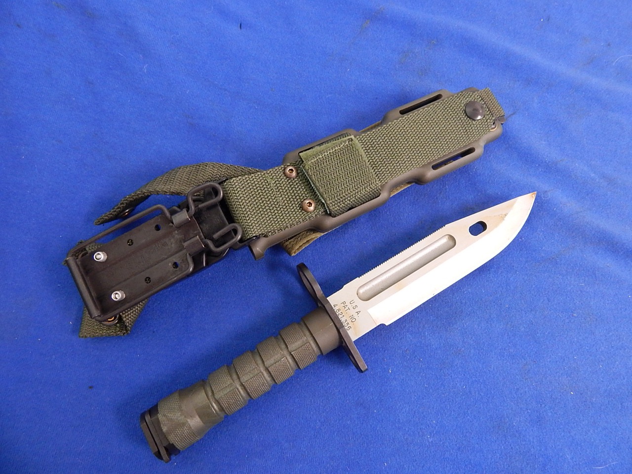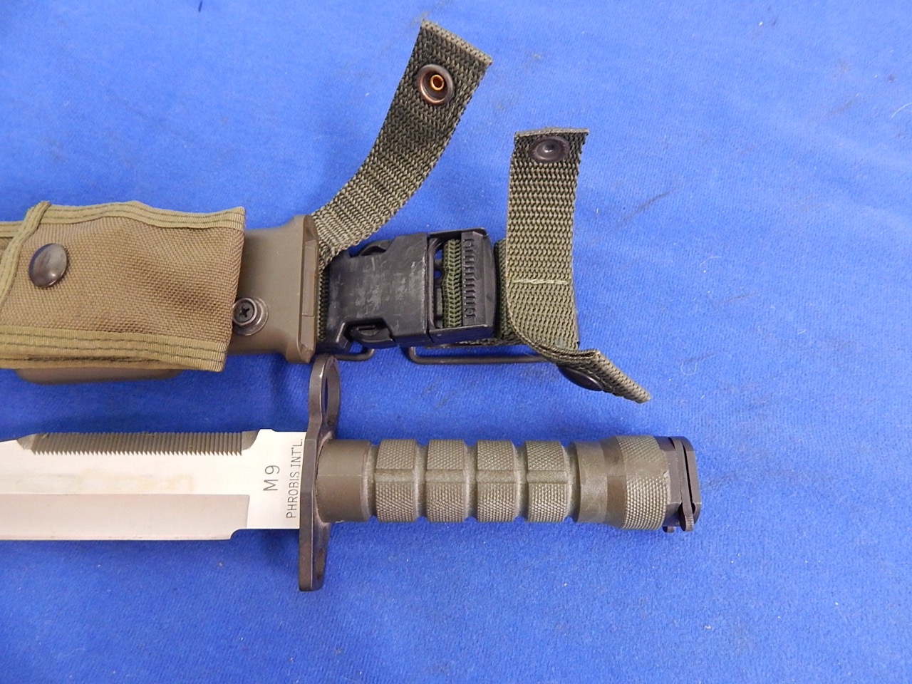 M-9 Phrobis Knife Bayonet W/S overall 14″ in excellent + minty condition. Blade marked M-9 Phrobis Int’l Spain and patent marks. These were multi purpose used as a fighting knife, utility knife, and bayonet for M16 rifles, M4 carbines.