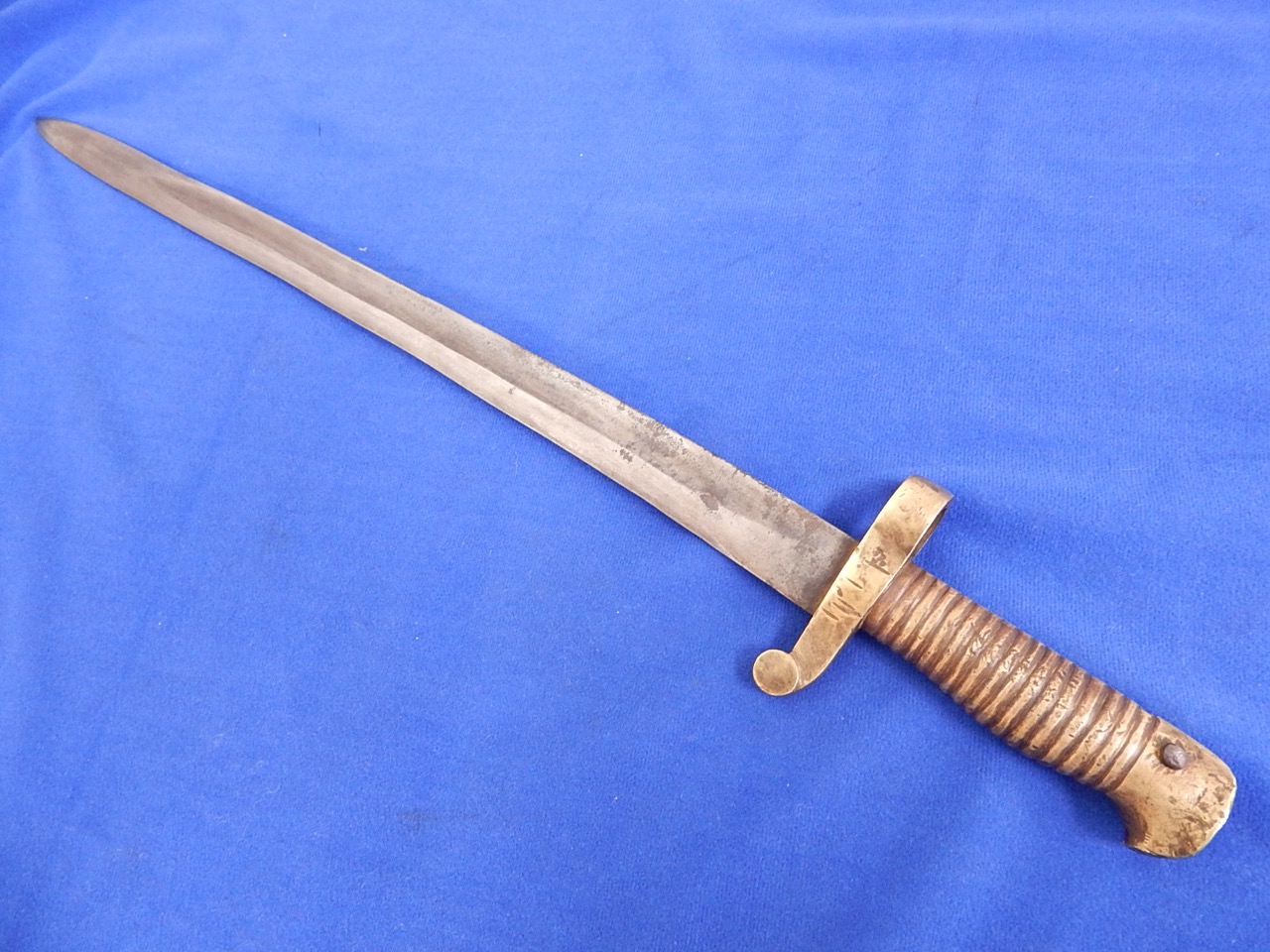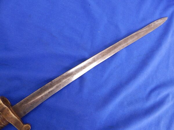 Merrill Rifle Sabre Bayonet sn #71xx, overall 24″. Bayonet remains in very good + condition. Blade has scattered fine peppering. Push button functions well.