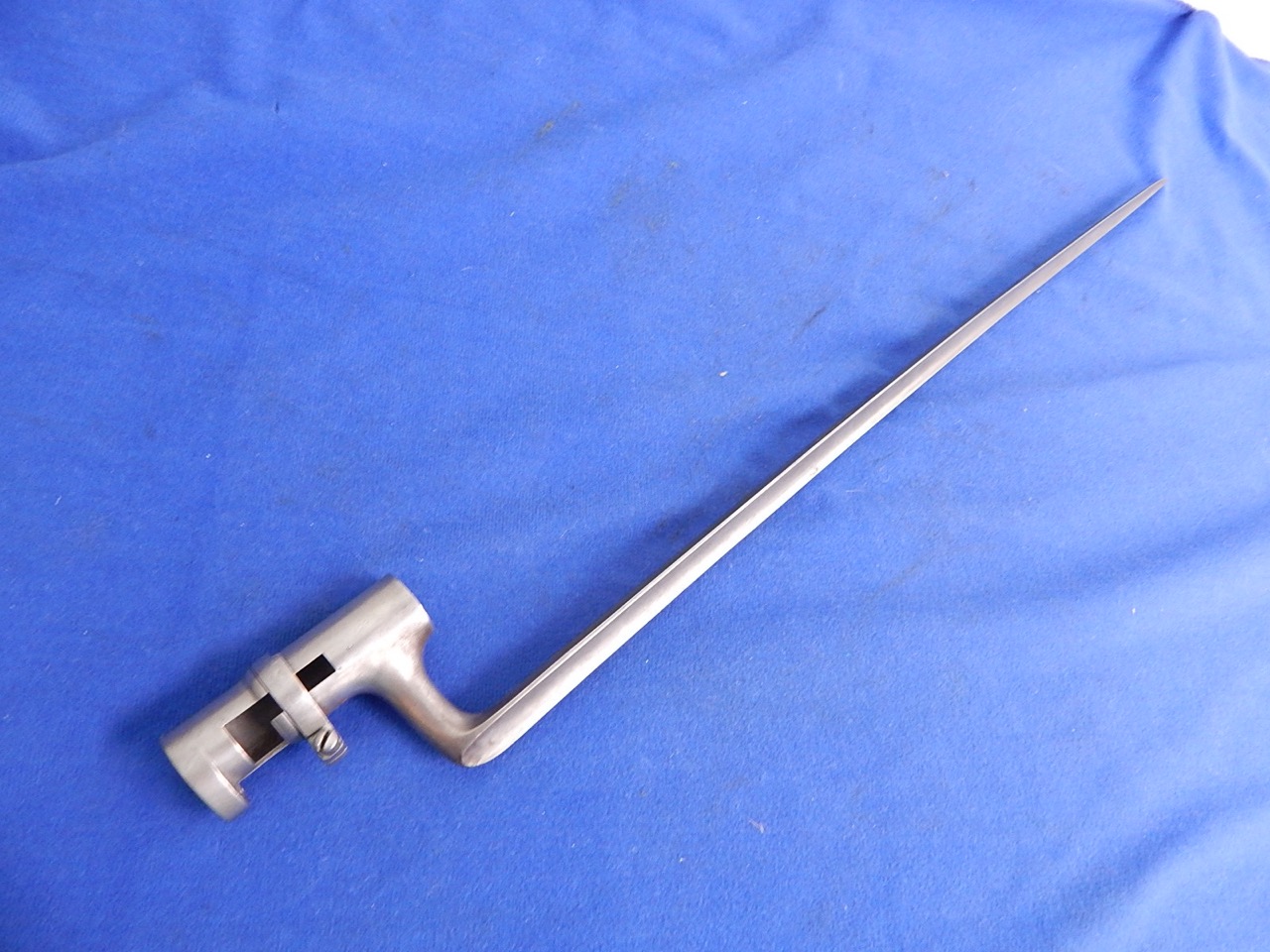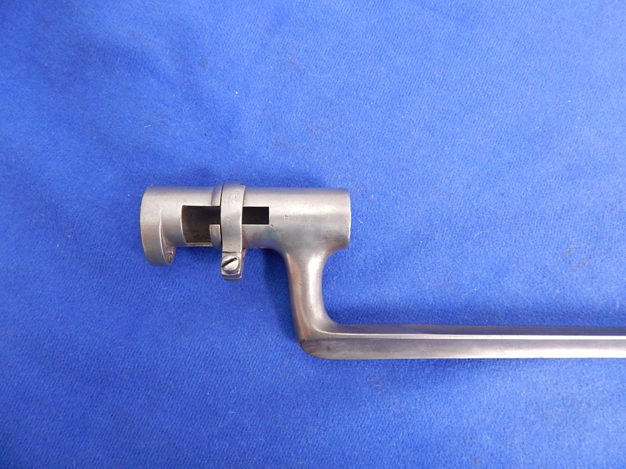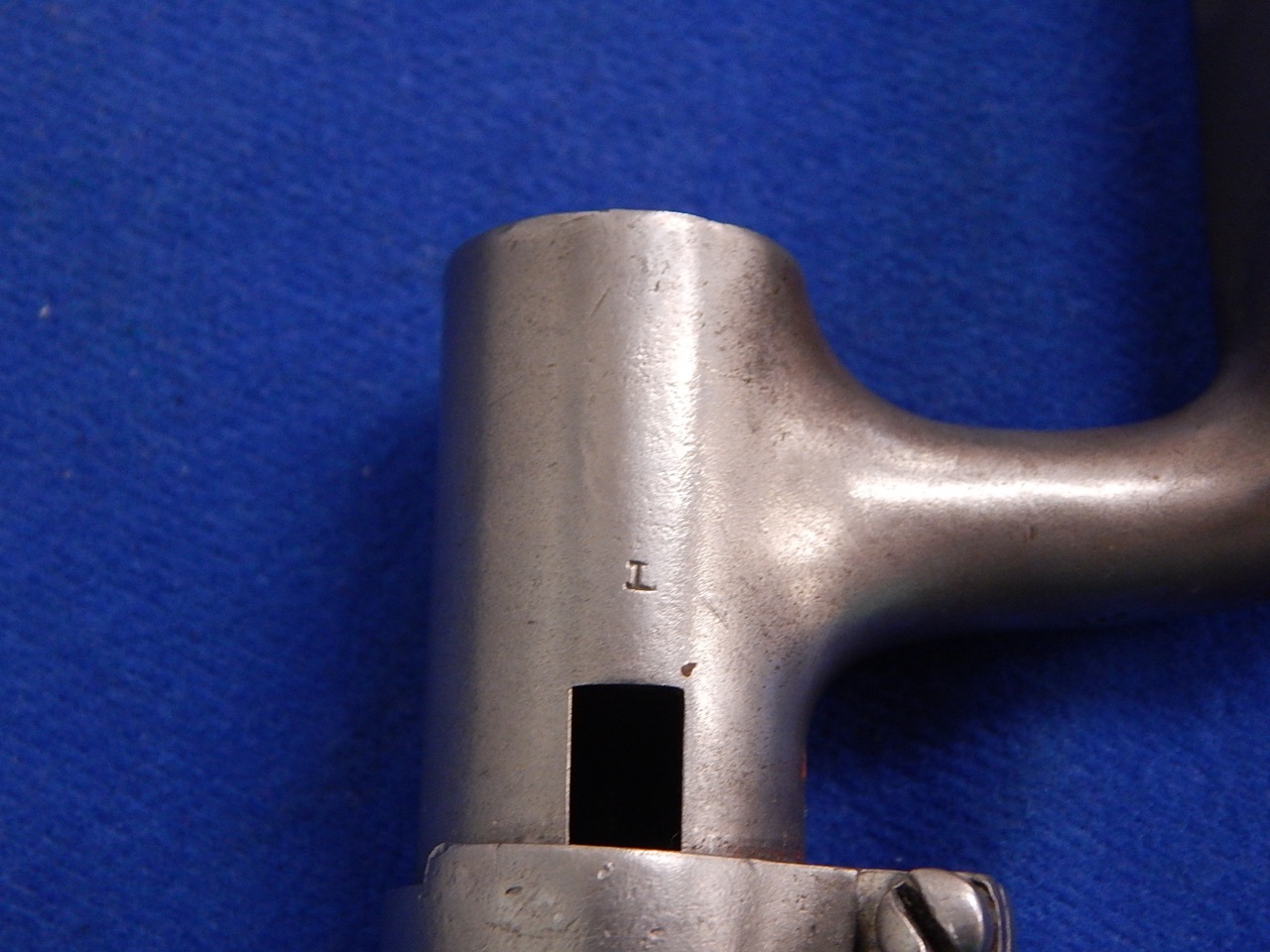 Spencer 1st Model Socket Bayonet overall 21 1/2″, socket 3″, blade 18 1/2″, inside MRD 21.13 mm in fine condition. Socket has an L inspection. These were used with the first few thousand rifles that had seen action at Gettysburg. There is also a known image of one of these bayonets on a Sharps Berdan Rifle.